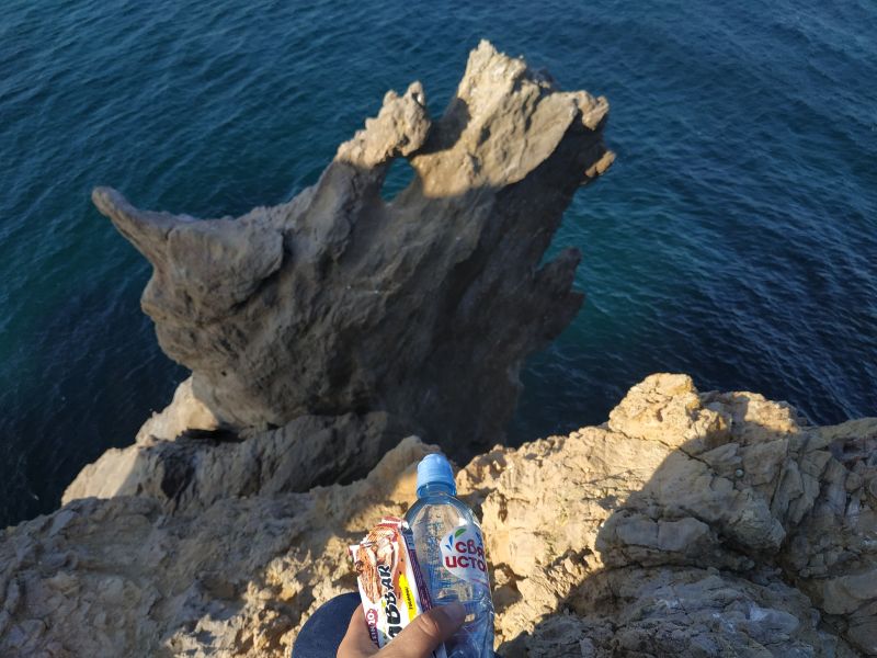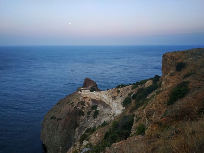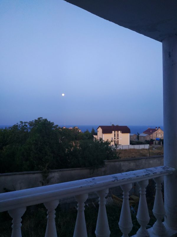 В процессе сборов вышла на балкон - шикарно, солнце ещё не взошло. Оно должно всходить с другой стороны, но я задалась несколько иной целью, чем посмотреть просто рассвет. Это нестандартная поездка: проснуться до рассвета и смотреть не на восход солнца, а на заход луны; оказаться в Севастополе и не мчаться к памятнику затопленным кораблям. Луна ещё не зашла, а сегодня она полная и это выглядит потрясающе на фоне моря и скал. Как жаль, что не могу передать этого с помощью фото