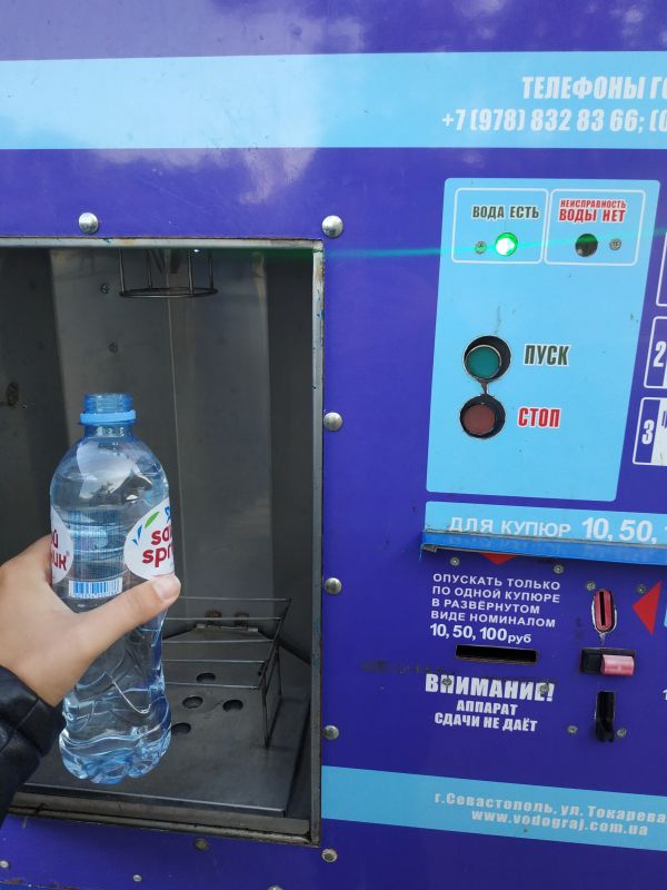 По пути мне попался автомат с водой. Так даже лучше - меньше пластикового мусора и по цене дешевле. Поллитровая бутылочка нормальной воды обошлась бы мне от 23 рублей и выше, а так всего 2 рубля.