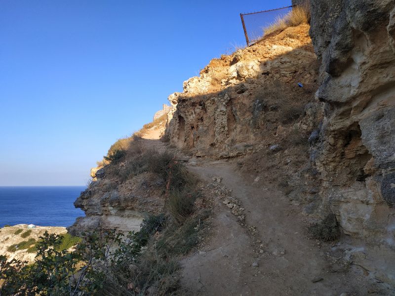 Иду, иду, теперь тропинка уходит за забор довольно близко к краю скал. Похоже на то что мне надо. Соответственно я иду по ней.
