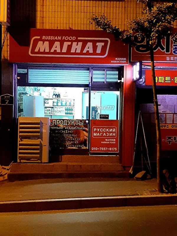 Уже поздно вечером, мы шли на автобусную станцию, и я случайно на противоположной стороне увидел знакомый логотип. Присмотрелся, и уже подумал, что сошел с ума! Показал парням, и нам не оставалось ничего другого, кроме того, чтобы перепрыгнуть через перила, перебежать дорогу и посмотреть, что там внутри. Удивительно, но в Корее полно подобных магазинов, которые продают товары из России.