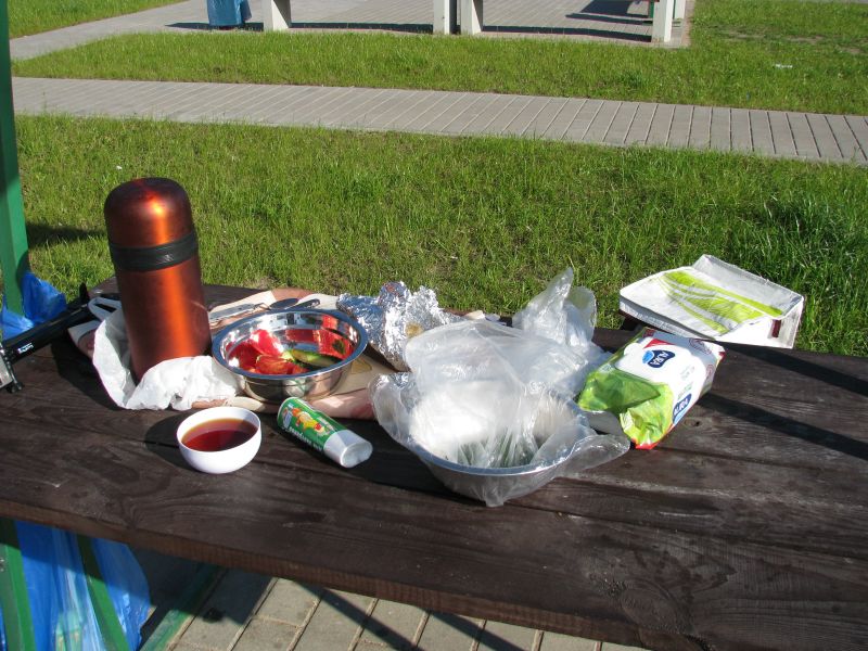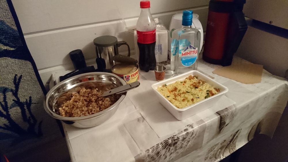 Ну, а питался я преимущественно тем, что привез из дома — рыбные консервы, крупы (рис, гречка, утренние каши), всякие супы быстрого приготовления и сладкий сухпаек (печеньки, конфетки). На первый день продукты мне собрала Аня (яйца, овощи, курица).