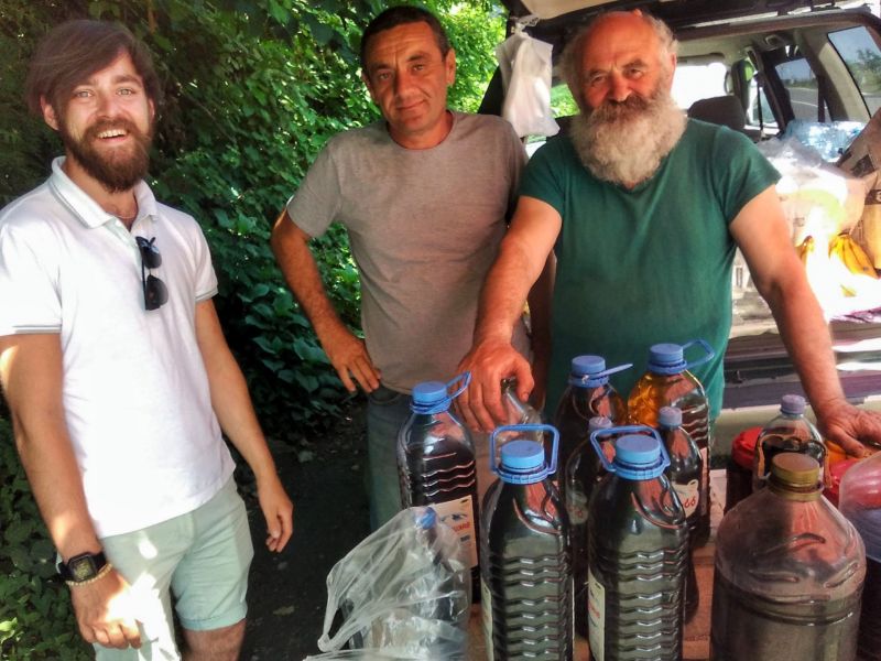 Прошу, знакомьтесь, Мераби Джамбули. Добрейшей души человек, путешественник, винодел и просто улыбчивый дед. Летом продает вино в Батуми, всегда на этом месте, осенью едет в Тбилиси, так как там туристов в это время больше, ну а зима-весна время путешествий.