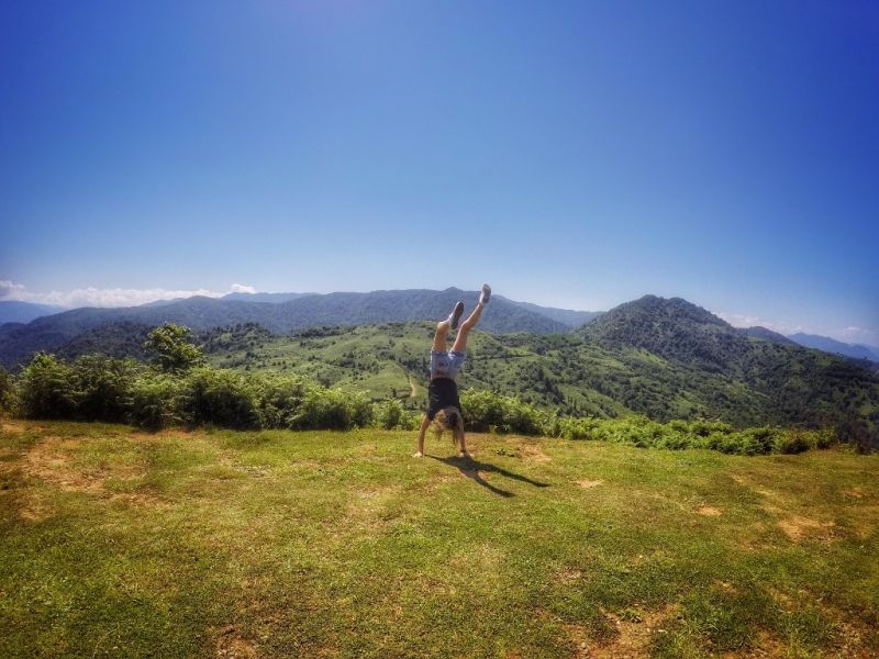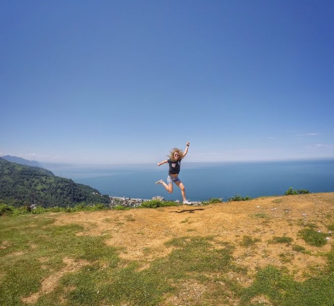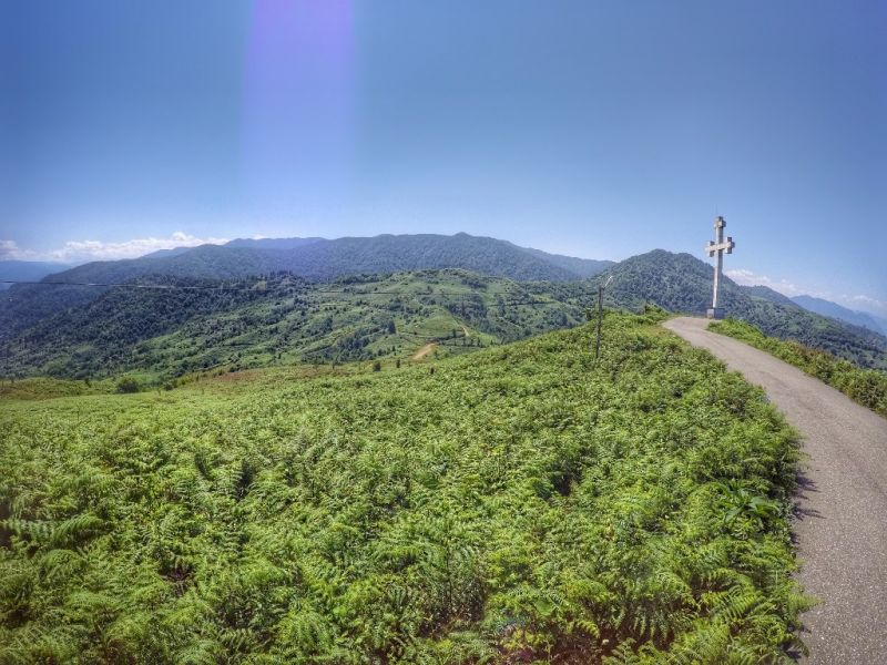 Через 30 минут мы были в потрясающем месте! На горе над деревней Гонио. Место тихое, безлюдное и весьма колоритное тем, что на самой верхушке горы возвышается необъятных размеров крест, а вокруг него горы, поля с канабисом и безкрайнее море. Ну с коноплёй я конечно приукрасила, но Джамбулат сказал, что там поглубже все есть)) кто ищет, тот всегда найдёт! Я конечно пошла искать, но как только я зашла в поле, все ноги и руки мне обожгло, как крапивой! Я обернулась, взглянула на этот крест и все поняла! Большой брат следит за тобой, но не лайкает)))