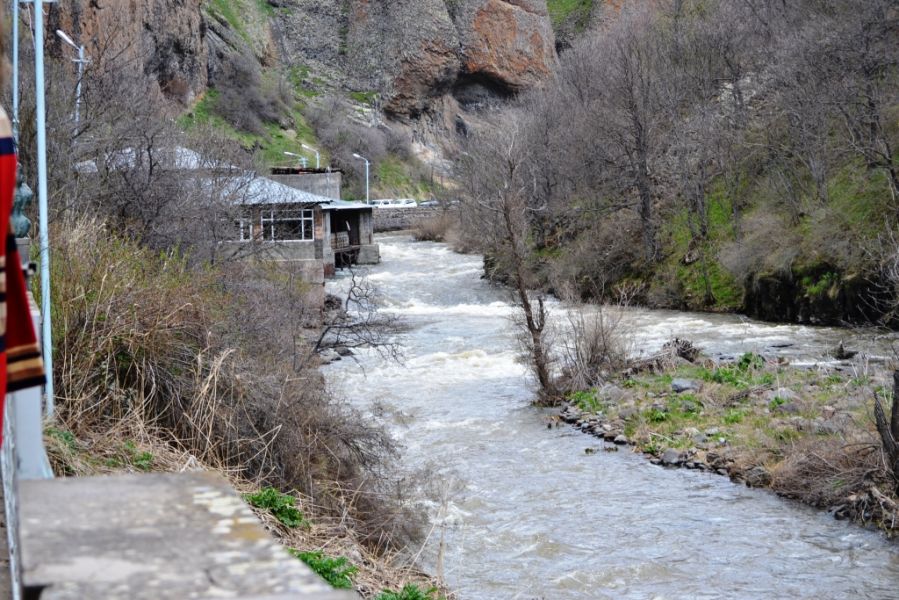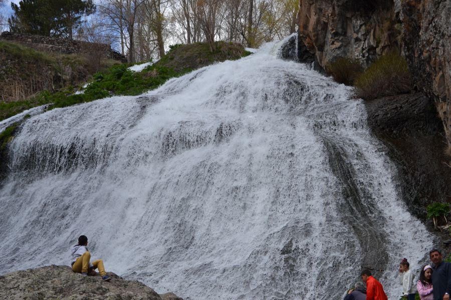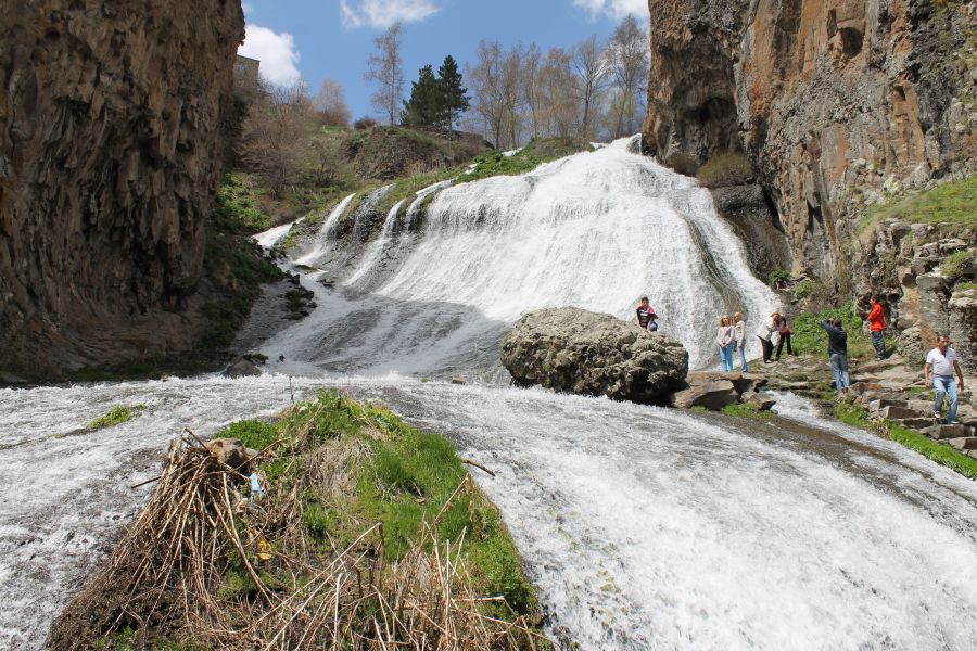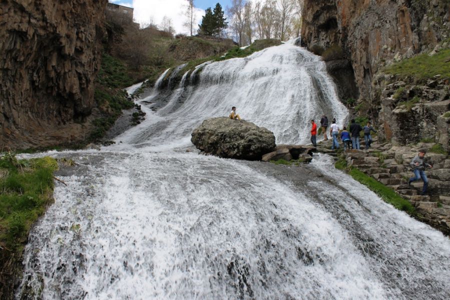 Местные отдыхающие посоветовали нам побывать на местной достопримечательности-водопаде Джермук на реке Арпи. С трудом найдя автомобильный спуск в ущелье реки, мы припарковали машины и вот оно чудо. Во всю ширину каменного ложа с высоты 68 метров стекает пенистый поток воды, играя жемчужными пузырьками.