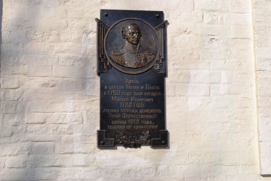 Один из местных посоветовал побывать в церкви Петра и Павла, в которой крестили знаменитого казачьего атамана Платова, именем которого назван новый аэропорт Ростова- на- Дону. Церковь оказалась закрытой, мы лишь по мемориальной табличке убедились, что крещение атамана произошло именно здесь.