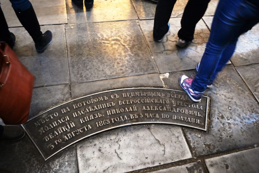 На полу в соборе наличествуют металлические плиты с надписями, свидетельствующими что в нем молились российские императоры и великие князья.