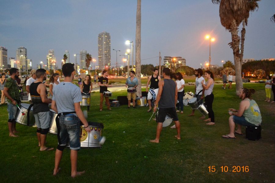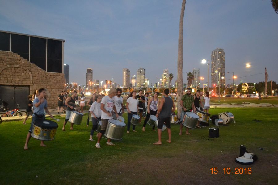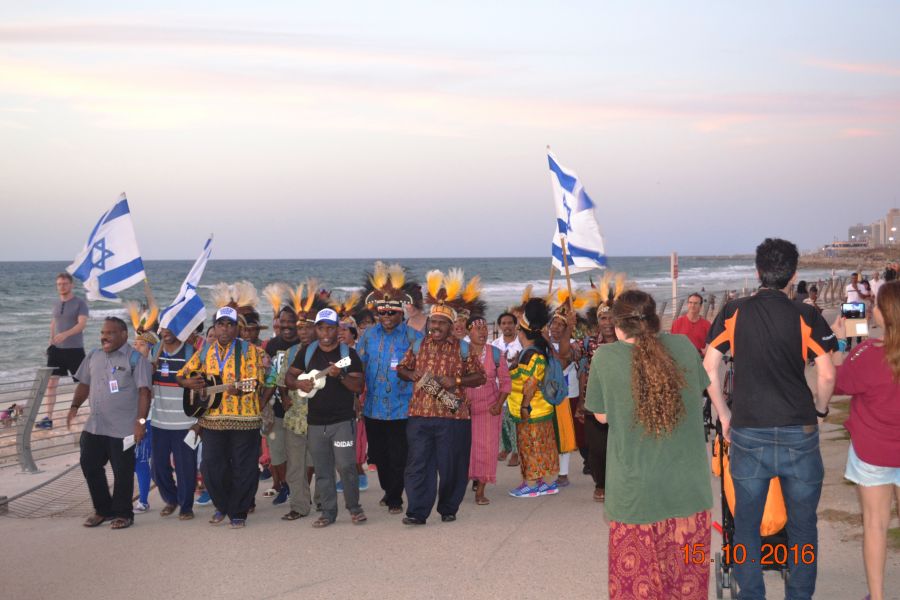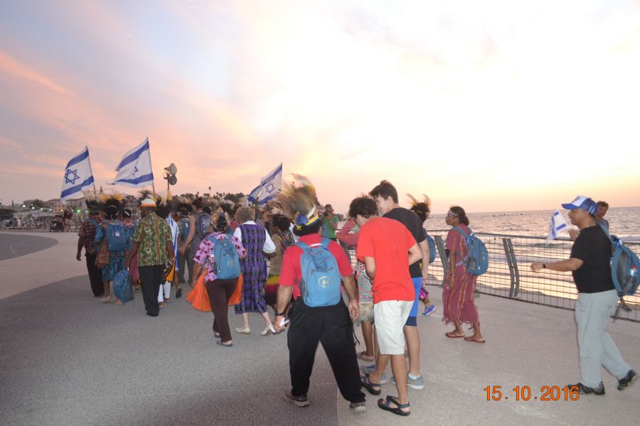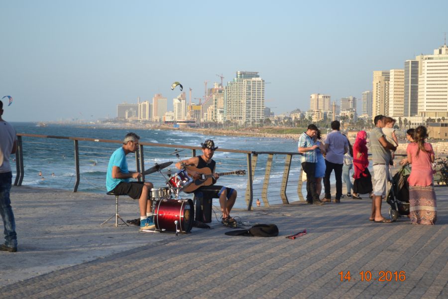 Обернувшись на шум, мы увидели, как по набережной шествовала группа, ну очень загорелых людей и экзотично одетых людей, которые, пританцовывая, пели оду Израилю под сопровождение гитар и барабанов. Слов серенады я не понял, но что концерт исполняется в честь страны нашего пребывания было ясно. Периодически группа дружно напевала "Вива Исраэл".