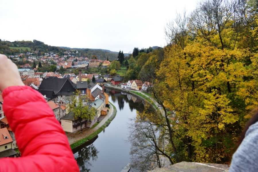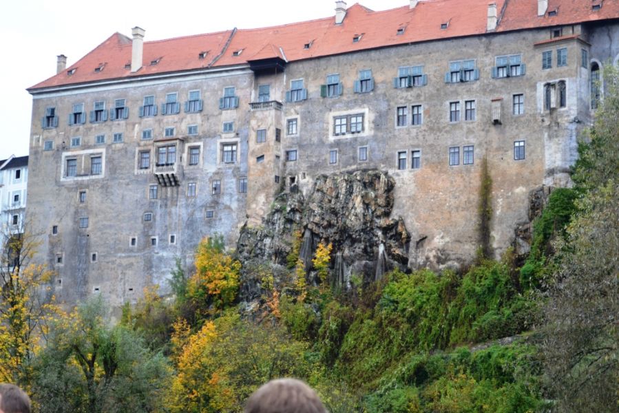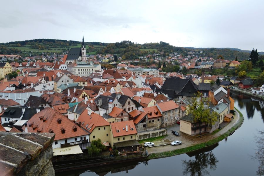 Экскурсовод завел нас на территорию замка с высокой его части, откуда с крепостной стены открылись шикарные виды прилегающего, на изгибе Влтавы, старого города. Разноцветные и разнокалиберные домики создают неповторимую палитру средневекового города. Полюбуйтесь. Казалось, что мы попали в сказку.