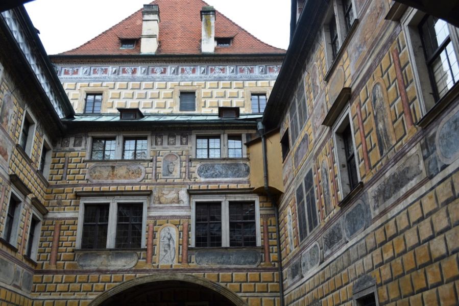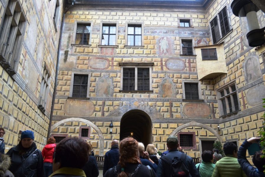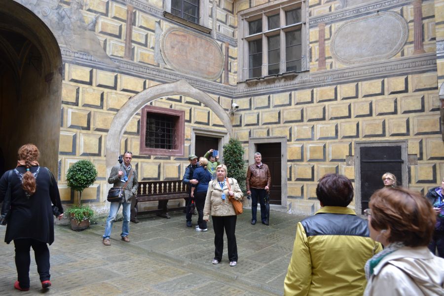 Далее группа втянулась в анфиладу внутренних двориков, Стены замка оформлены в едином стиле с сохранившимися фресками и особой раскраской, называемой трудным словом "сграффито", когда нарисована кладка. Потом такое украшение мы видели и на некоторых домах в старом городе.