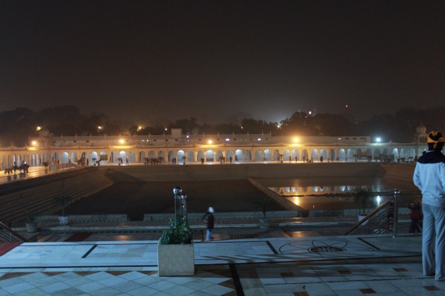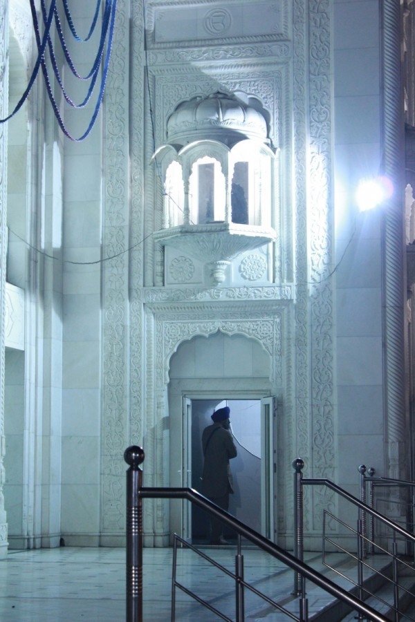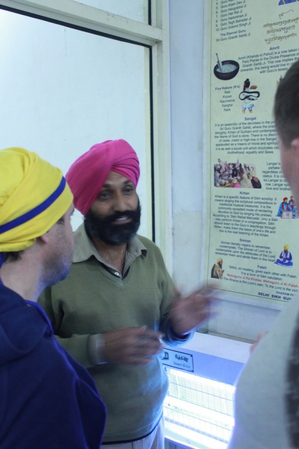 Затем Балджиндер самостоятельно организовал нам экскурсию в сикхский храм — Гурдвара Бангла Сахиб. Этот храм был построен в 1783 году сикхским генералом вместе с девятью другими известными гурдварами. Сикхизм отличная от других монотеистическая религия. Основана в Пенджабе на северо-западе Индии гуру Нанаком (1469–1539). Сикхи (от пенджабского слова последователь, ученик) — верят в Единого Бога настоящее имя которого никому не известно. Бог рассматривается в ипостасях Ниргун (Абсолют) и Саргун (персональный Бог внутри каждого из людей). До Творения был только Абсолют и не было ничего, ни рая, ни ада, ни трех миров, только Бесформенное. Когда Бог захотел выразить себя (как Саргун) он сначала нашёл свое выражение через Имя, и через Имя появилась Природа, в которой Бог растворен и присутствует везде и распространяется во всех направлениях, как Любовь. Существует правило пяти «К», сикх обязан сохранять при себе пять предметов: Кеш — нетронутые волосы, спрятанные под обязательную чалму; Кангха — гребень, поддерживающий волосы; Кара — стальной браслет; Качх — короткие штаны в качестве нижнего белья; Kирпан — меч или кинжал, спрятанный под одеждой. А еще у нашего сикха был дополнительный обязательный предмет — металлическая палочка, которую он периодически доставал и чесал ей голову под чалмой. :) Такая вот своеобразная религия.