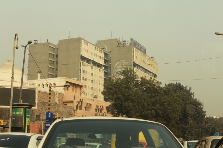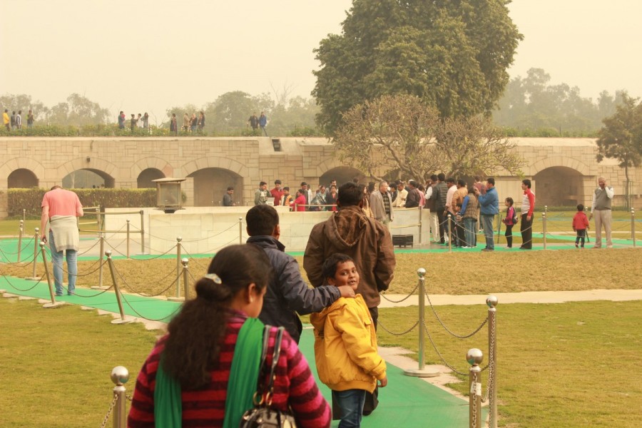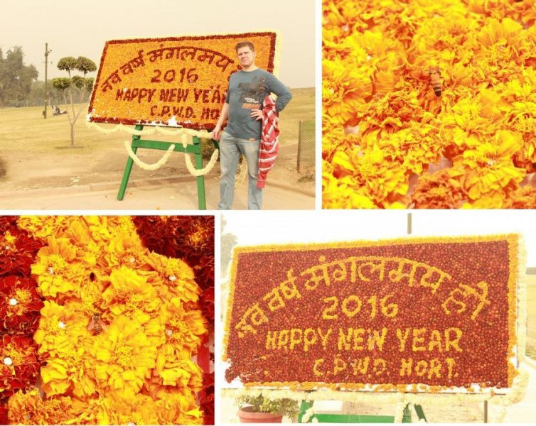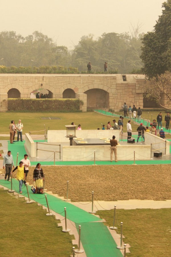 По пути посетили парк Радж Гхат, который, как город был заложен тем же Шахом Джаханом. Это место известно тем, что там находится мемориал Махатмы Ганди. Он возведен на месте его кремации (самадхи). Там же находятся мемориалы Индиры и Раджива Ганди. Но люди туда идут, в основном, чтобы почтить память знаменитого политического деятеля погибшего от рук убийцы в 1948 году. Вот такой занятный постер (не знаю как его еще назвать) из цветов на входе. Весь облепленный пчелами. И на выходе такой же.
