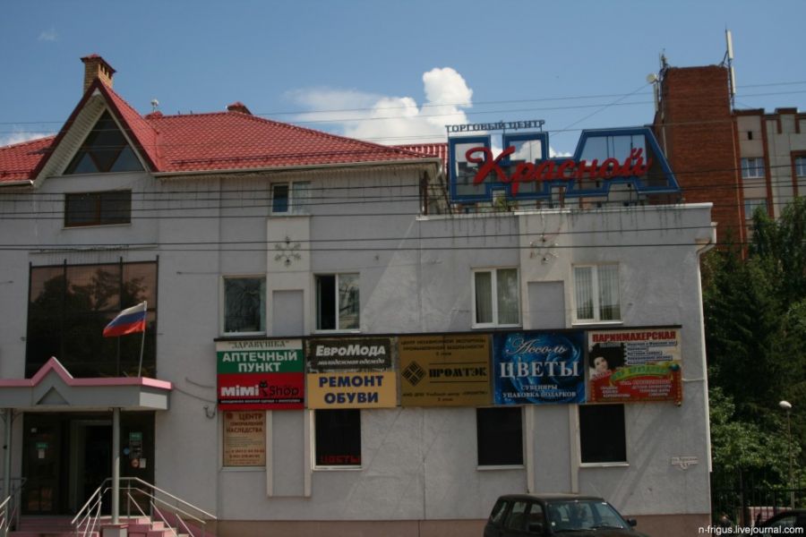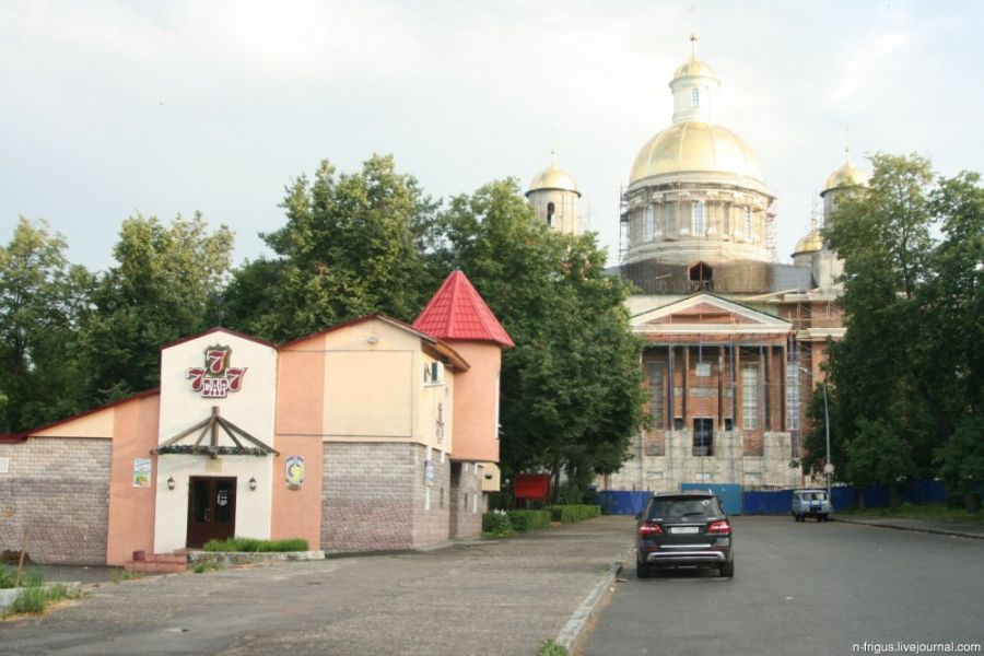 Собственно, вот и она. Вся Россия в одной картинке: бар "три топора", лакшеримобиль, строящаяся церковь и ментовский бобик.