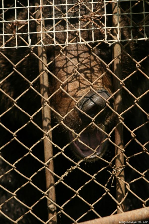 Медведу очень жарко. Если, для белого организовали бассейн, то бурый просто мучается еще и в такой маленькой клетушке.