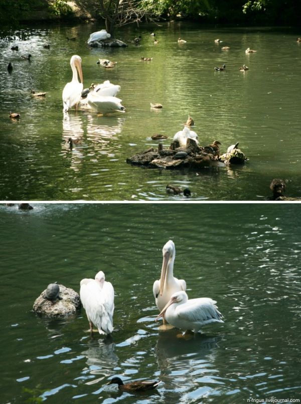 Небольшой прудик с различными пернатыми и черепахами. Но конечно выделяются среди всех прочих величественные пеликаны.