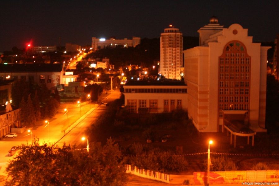 Ночной вид из окна квартиры. Справа явно давно пустующее здание, так и не сданное. Непонятно почему.