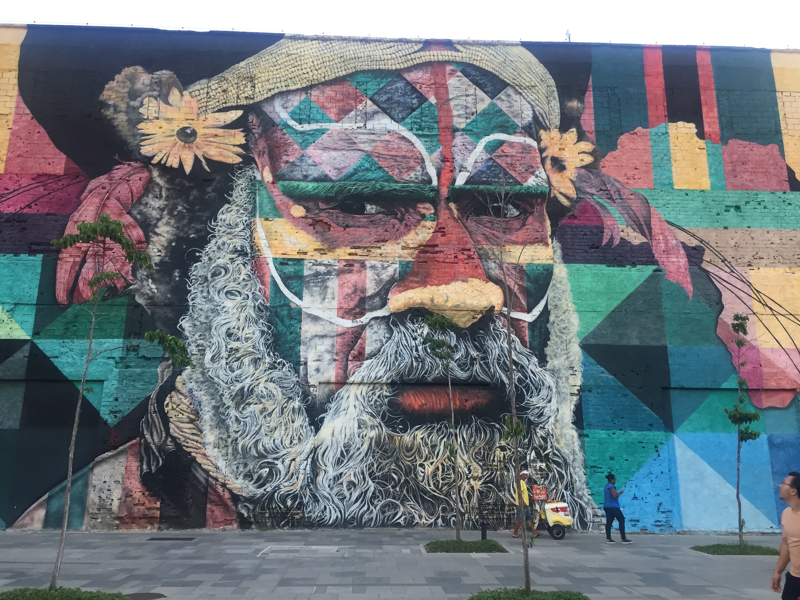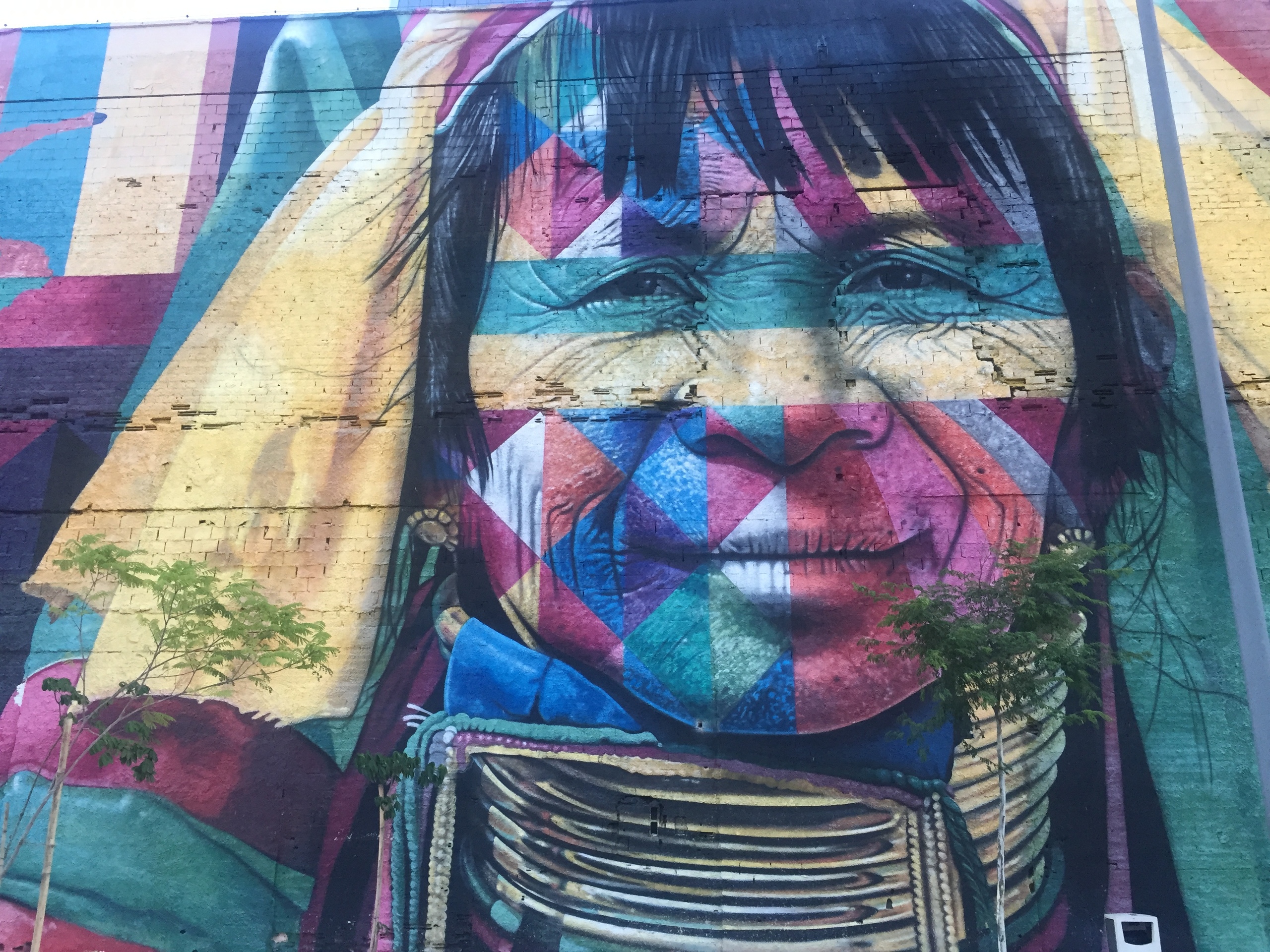 А вот одна из самых больших граффити-стенок в мире. Когда-то эта работа считалась самой масштабной в мире, но рекорд уже побит. «Этносы» были нарисованы к Олимпиаде художником Эдуардо Кобра. Композиция из 5 лиц - представителей коренных племён пяти континентов.