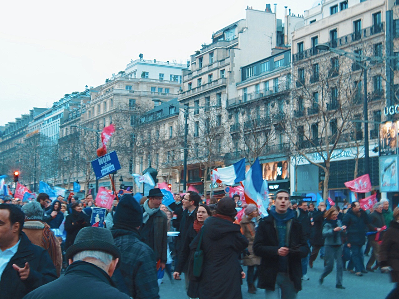 Итак, что же делают абсолютно все уважающие себя французы? Правильно, они бунтуют! Причём не важно какой день недели, сколько время и сколько денег нужно потратить на весь инвентарь. На один такой "бунтарский парад" попала и я. В то время как раз лил сильный дождь, а мне срочно нужно было добраться до Елисейских полей. В итоге, станция на которой мне нужно было выходить была закрыта. Мне пришлось выходить и идти пешком. Тогда я вся промокла, опоздала на встречу и чуть не попала в полицию. Соль всего этого действа в том, что из-за парадов перекрывают дороги и ветки метро, которые находятся поблизости с бунтарями. Из-за этого приходится опаздывать, мокнуть под дождём, тратить время на прохождение ещё нескольких кварталов и убегать от полицейских, которые забирают с собой всех, кто находится рядом с местом взрыва домовых шашек. Зато впечатлений потом столько, что можно романы писать!