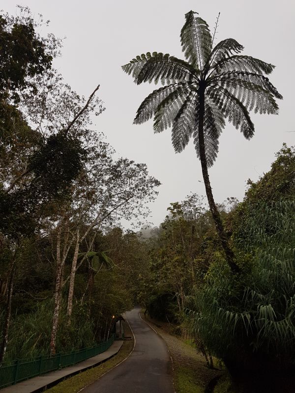 Далее в планах значилось вновь отправиться в национальный парк и посетить ботанический сад; но пока я кушал, внезапно начался ливень, продлившийся около 2-х часов (с 14:15 до 16:15). Вот же не повезло восходителям, да и смог бы я сам взойти на вершину при такой погоде без специальной обуви, подумалось мне. После дождя солнце отнюдь не выглянуло,- наоборот, складывалось впечатление, что это лишь непродолжительная пауза перед новым, более мощным залпом. Но нужно было идти, ведь еда переварилась, мышцам требовалась нагрузка, да и убивать время в отеле – последнее дело. Поэтому, недолго думая, я попросил на ресепшен зонтик, пополнил запасы воды и около 16:30 вновь вышел на уже знакомую, но по-прежнему не шибко дружелюбную, особенно после недавних осадков, дорогу.