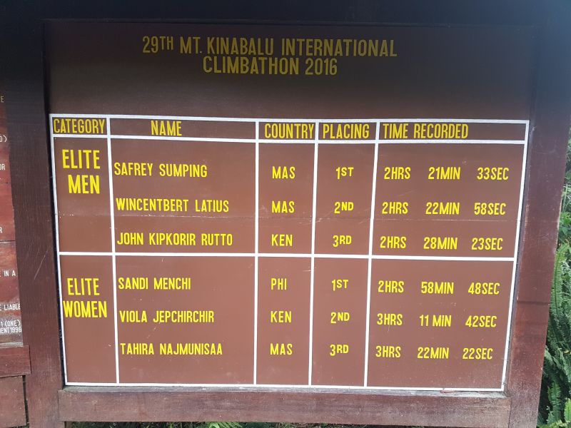 Дойдя до точки, с которой путешественники обычно начинают покорение горы, я обратил внимание на стенд, посвященный скоростным восхождениям на Кинабалу. Да-да, каждый год тут происходят международные соревнования, подобно забегам на наш Эльбрус. Судя по записям, в 2016-м году чемпионом среди мужчин стал спортсмен из Малайзии с итоговым временем 2 часа 21 минута и 33 секунды, а победительницей оказалась филиппинка, которая достигла вершины за 2 часа 58 минут и 48 секунд.