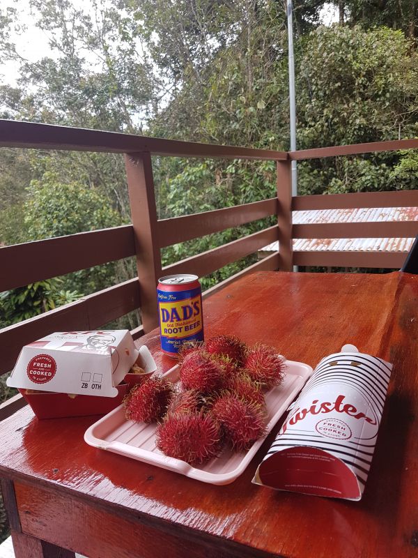 Вот и настало время долгожданной трапезы - я разложил свои припасы, включая рамбутаны, на балкончике, открыл корневое пиво, и с наслаждением, наконец-то, подкрепился!) Если бы еще Кинабалу открылась, было бы совсем чудесно!