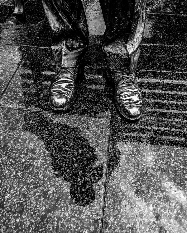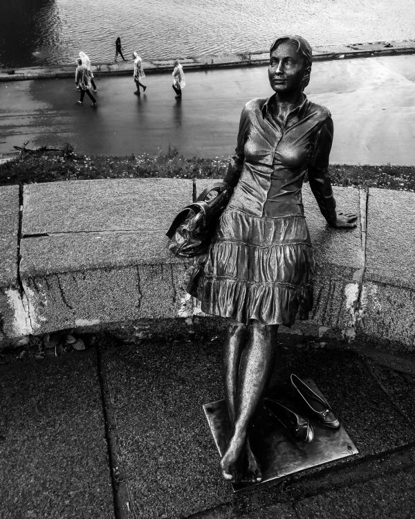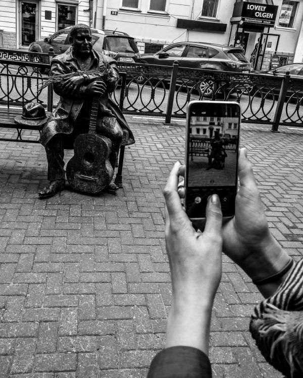 Если бы не прохожие в дождевиках, то точно в корзину фотка, даже несмотря на то, что похожая картинка есть у премьер-министра – только он рядышком с бронзовой девушкой сидит. Я не сел – в Новгороде были дожди. Мокро, но зато капли мозаичны