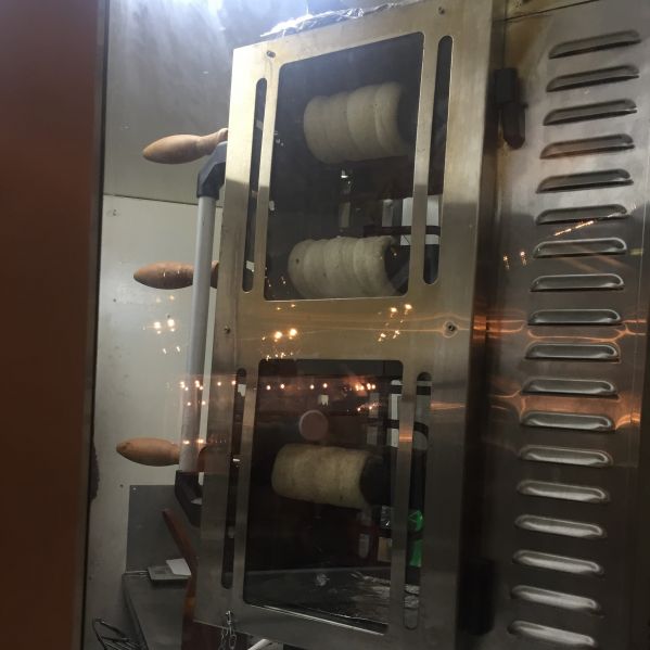 Ароматное дрожжевое тесто оборачивают вокруг деревянного вала и запекают в специальной духовке, посыпают сахаром с корицей и орешками.
