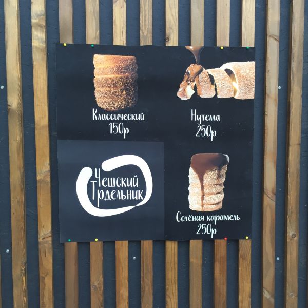 Оригинальный вариант стоит 150 рублей. Если вы сильно проголодались, можно заказать трдельник с нутеллой или соленой карамелью – такая вариация обойдется в 250 рублей, зато наедитесь. Это очень вкусно, недорого и я не знаю, есть ли где-нибудь в городе еще такая возможность – попробовать аутентичный чешский уличный десерт.