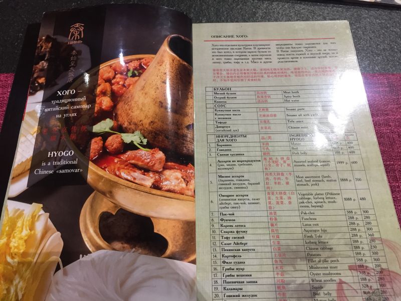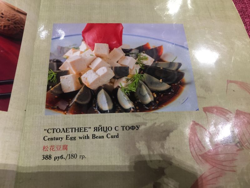 В меню ресторана, о котором идет сегодня речь, хого представлен на первой странице, и стоит весьма разумных денег. Помимо прочего, в основном меню можно встретить "баоцзы" – китайские пельмени со свининой, которые либо приготовлены на пару, либо обжарены до хруста. Есть и совсем экзотика. Например, лягушачьи лапки в кисло-сладком соусе, свиная голова или знаменитое "столетнее яйцо". О нем поподробнее: представьте себе куриное (иногда утиное) яйцо, выдержанное несколько месяцев в специальной смеси (щелочной среде) без доступа кислорода. Через несколько месяцев яйцо готово к употреблению без дополнительной обработки. Его кладут в салаты, пироги или просто едят с устричным соусом.