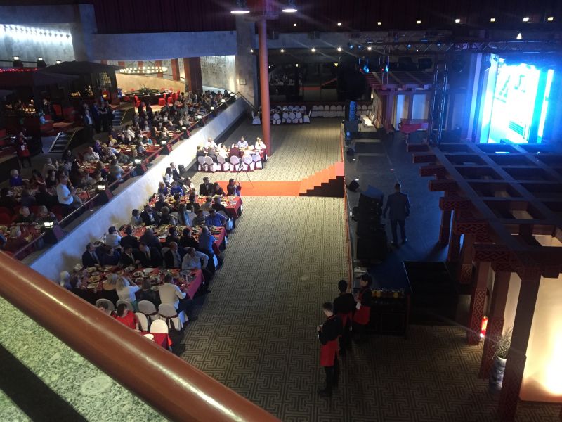 Сразу на входе установлены две высокие вазы традиционного китайского фарфора, метра под 2,5. На стойке ресепшн меня встретила хостесс и повела за мой столик. И тут я окончательно осознала – масштаб действительно грандиозный. Четыре этажа укомплектованы как обычными столиками, так и многочисленными приватными комнатами для больших компаний, деловых обедов и просто закрытых празднований. На первом этаже, в центре зала, располагается сцена с гигантским экраном. Пока я поднималась на третий этаж, мне пришла в голову мысль, что помещение, похоже, переделано из бывшего концертно-выставочного зала. Такой, знаете, с советских времен, когда размеры были особенно впечатляющими. Мой столик располагался как раз на месте бывшего балкона с захватывающей панорамой на весь ресторан и сцену.