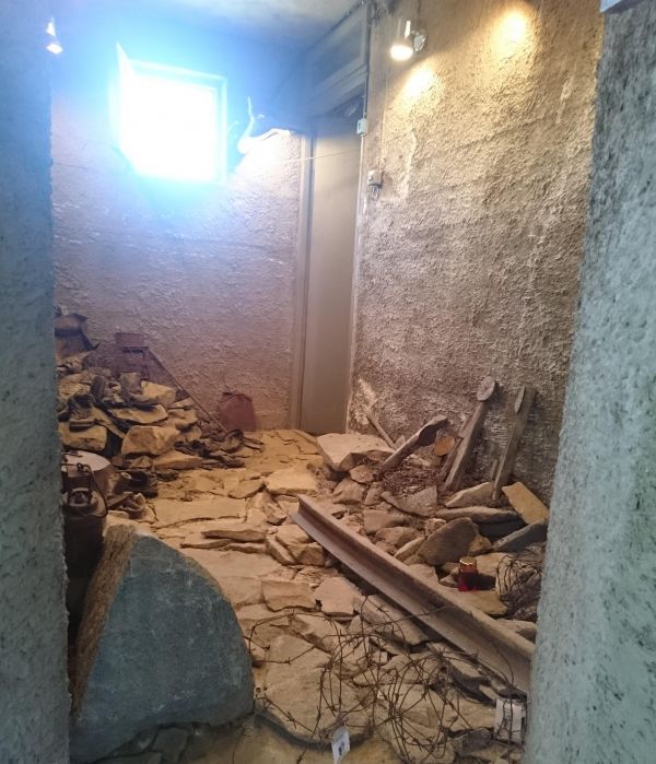 Лестница ведёт к тюремной камере. Сначала мне показалось, что там валяется какой-то мусор, но потом пригляделась - колючая проволока и кое-какие тюремные атрибуты: