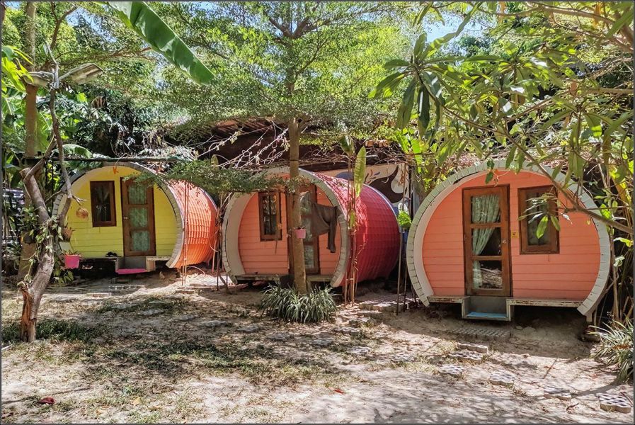 Дабы избежать в этот раз подобных приключений, мы забронировали жилье заранее. Ко Липе - остров расслабленного пляжного отдыха, там домой приходишь только ночевать, так что мы выбрали даже не отель, а хостел - душ-туалет во дворе, в номере только пара матрасов и вентилятор, зато сам хостел прикольный: круглые домики на тенистой полянке ровно посередине острова.