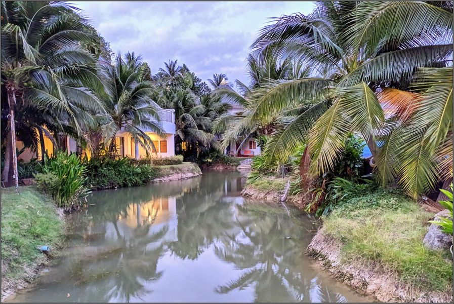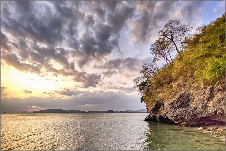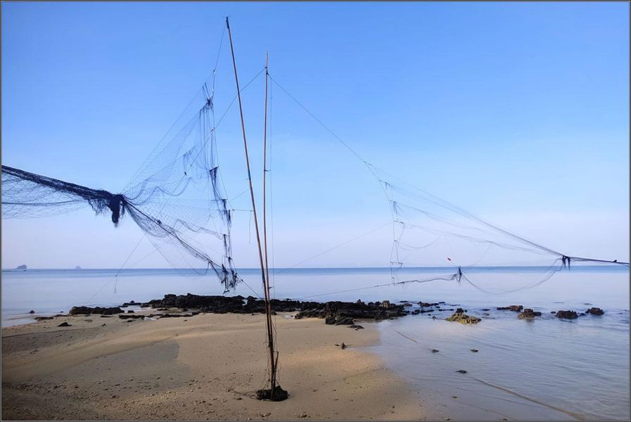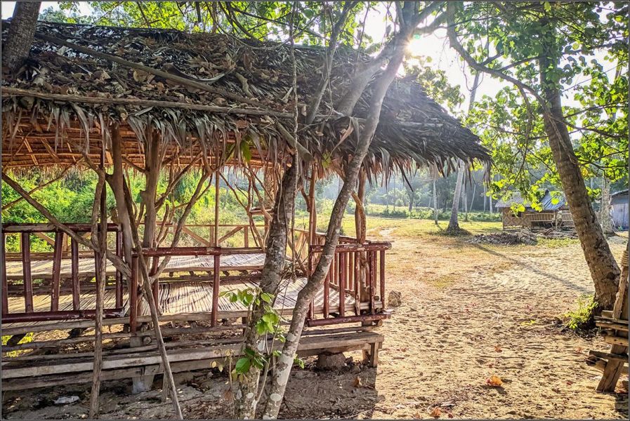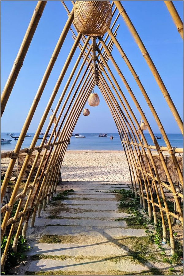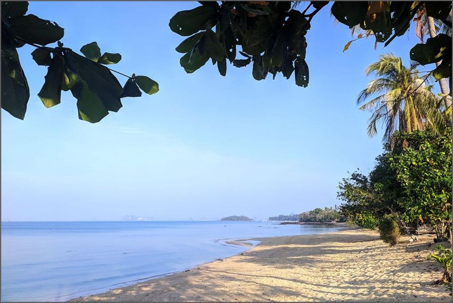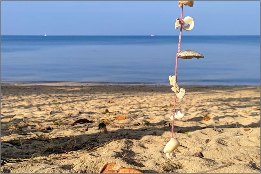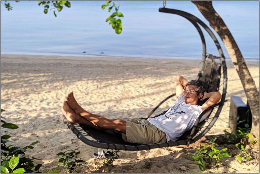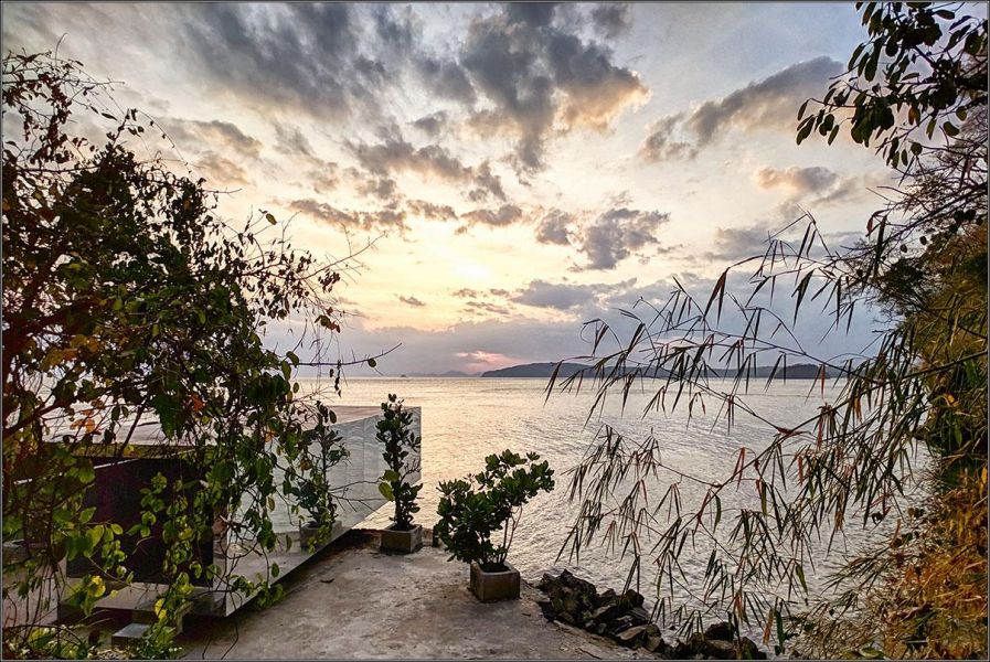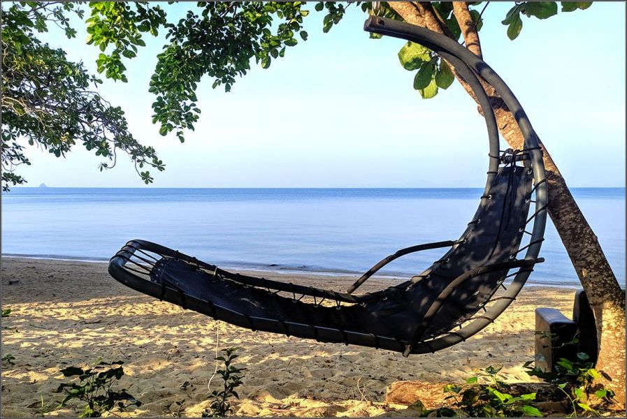 Тут есть маленький пляжик, который находится у резиденции принцессы Таиланда, там обычно тихо, спокойно и море красивое. Приехали туда сегодня прямо на рассвете, и вот - пожалуйста. Море тихое, вода прозрачная, людей вообще нет, даже тайцев в местном кафе. Красота и спокойствие, гамаки, диванчики, и очередные кустарные артобъекты какие-то вокруг.