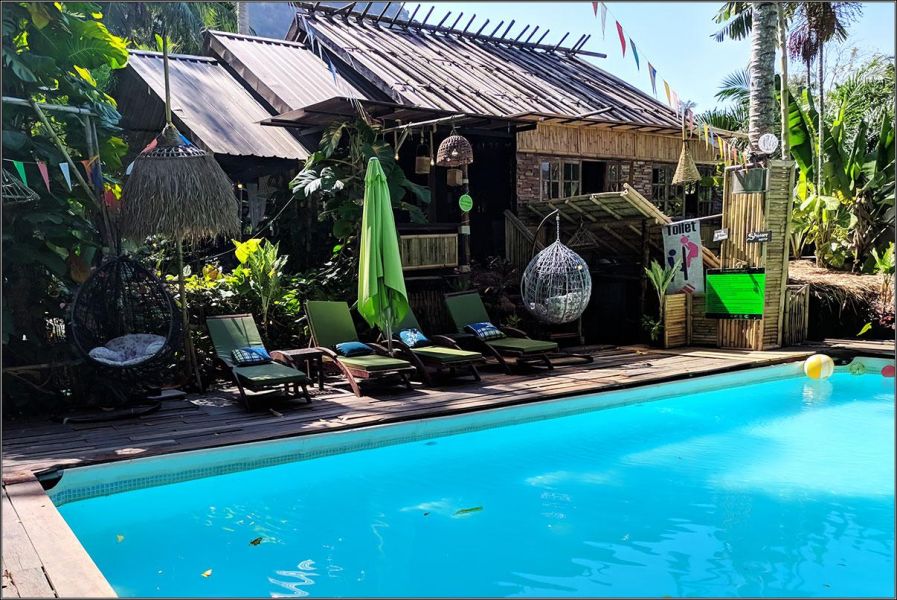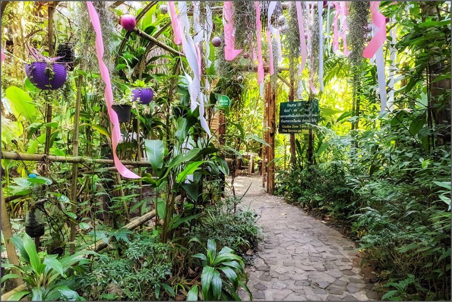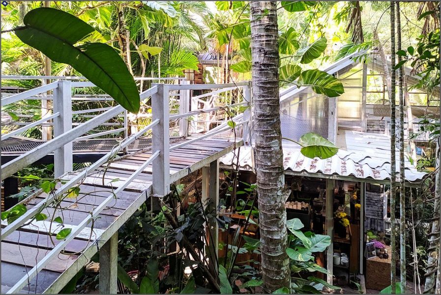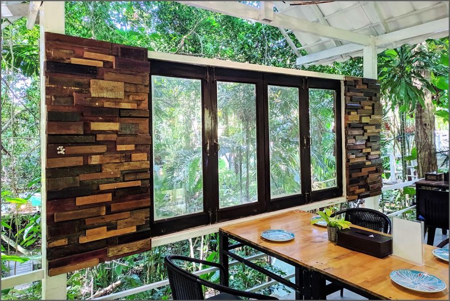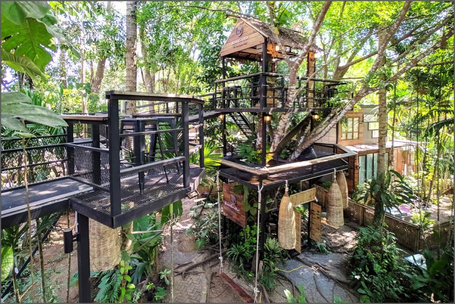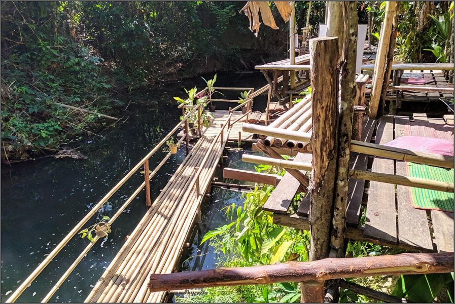 Это не просто ресторан, это прямо достопримечательность. На шоссе, ведущем в Клонг Муанг, прямо в джунглях, над небольшой речкой, построен целый комплекс: тропинки, настилы, дорожки, мостики, все это на несколько этажей, и везде столики.