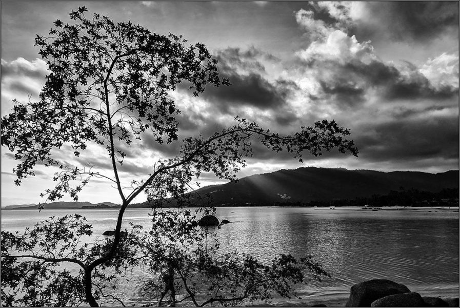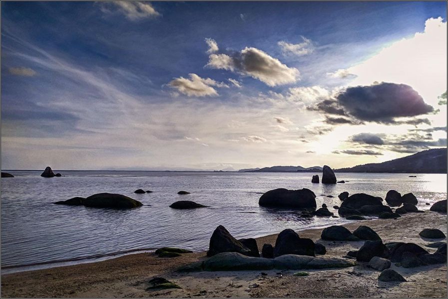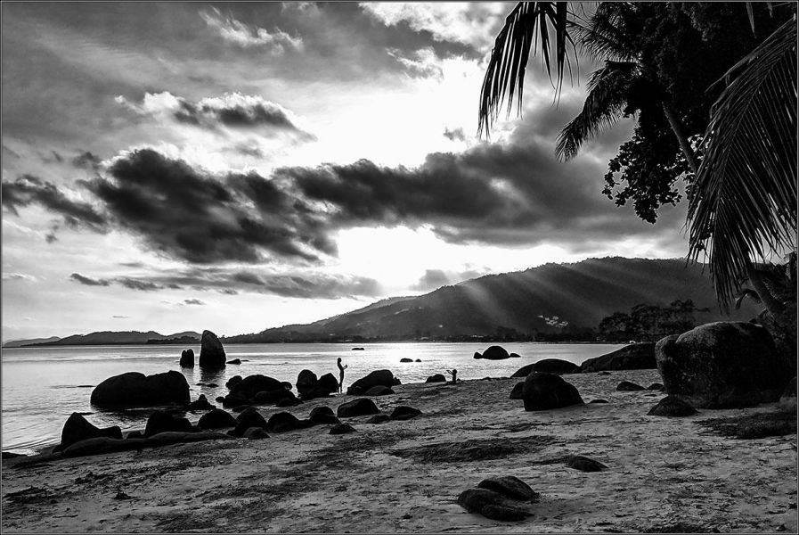 Вот - небольшой пляж на Ламае, крохотная бухта у отеля Bay View Resort. Ни разу раньше тут не был почему-то, а место красивое: камни в воде, деревья на скалах, тихое море и почти никого нет. Две пары европейских пенсионеров, пара мамочек с детьми, я с мобильником и закат.