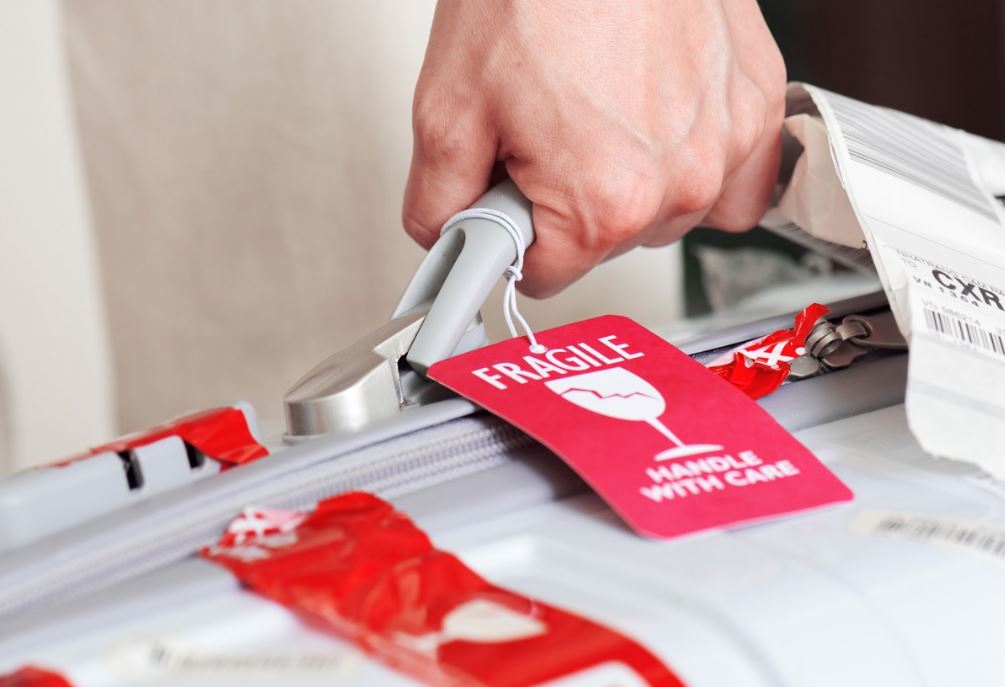Если вы перевозите хрупкие вещи или просто хотите, чтобы с вашим чемоданом грузчики обращались бережно, наклейте сверху на чемодан ярлык «Fragile».