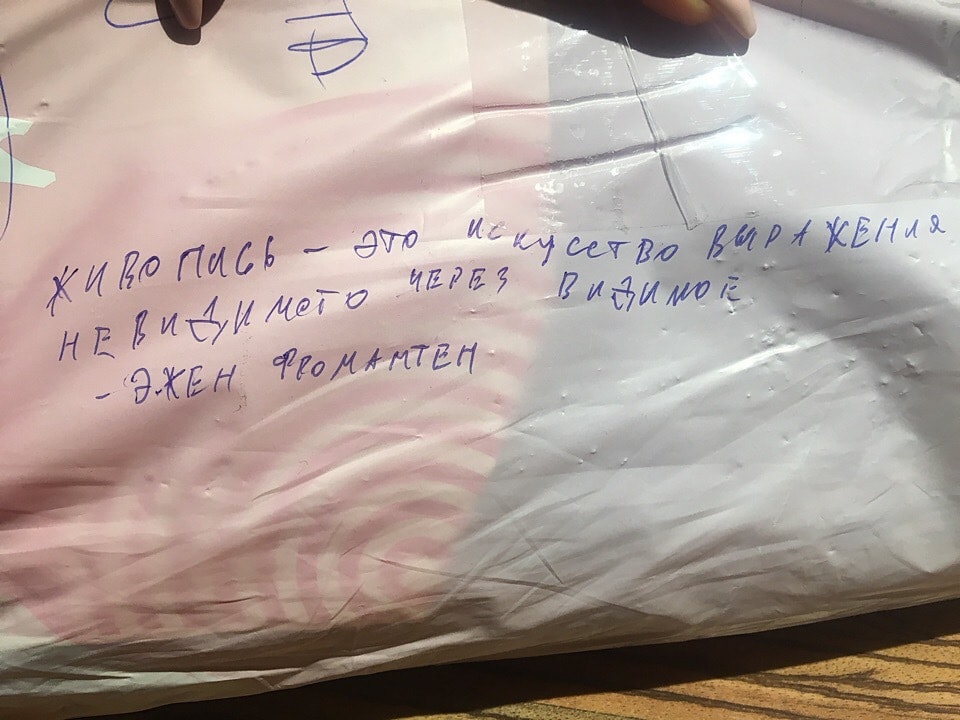 Перелет прошел как на иголках. Прибыв в аэропорт Пулково, Виктория панически смотрела, как падают чемоданы на ленту. Но ее картины там не оказалось! Спустя какое-то время, к девушке подошел мужчина и вручил ценный груз лично в целости и сохранности. Помимо самой картины она обнаружила послания от грузчиков.