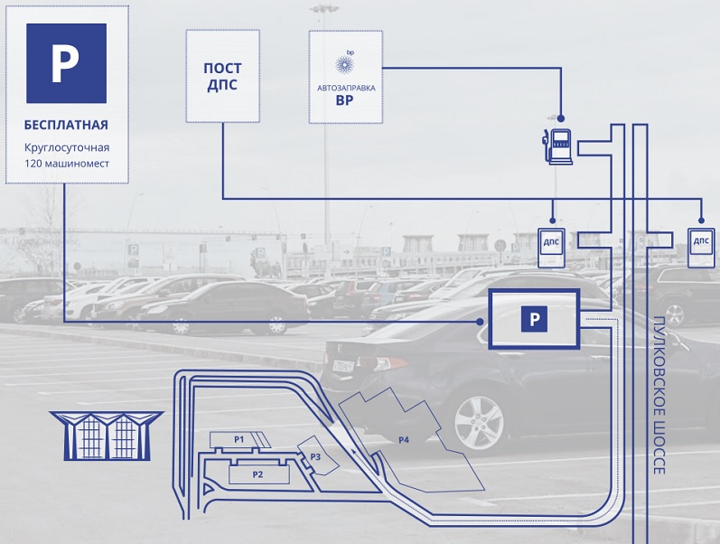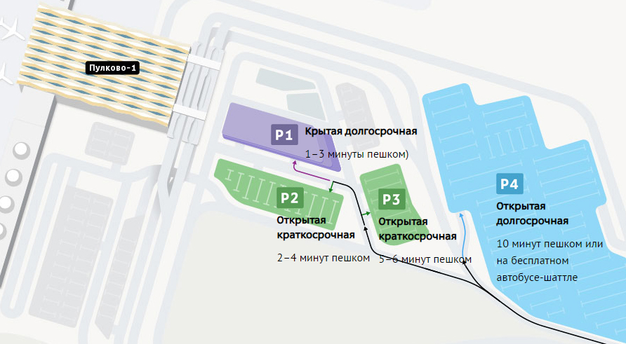 В аэропорту Пулково работают четыре платных круглосуточных парковки, две долгосрочных и две краткосрочных.