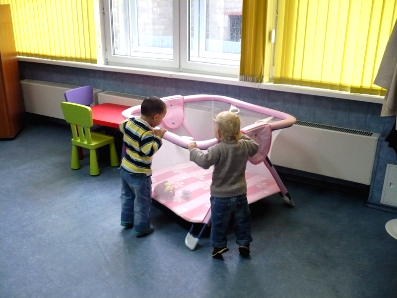 На входе в игровой зал сидит администратор, который регистрирует посетителей. Он же оповестит вас о том, что приближается время вашего рейса. С ребёнком проходит один взрослый, справка из медпункта не нужна. На полу в игровом зале постелен яркий ковролин. Игрушек достаточно. Есть две кроватки, пеленальный столик, телевизор с мультиками, столы и стульчики для кормления. Туалета, раковины, мусорной корзины нет. Игровой зал работает круглосуточно.