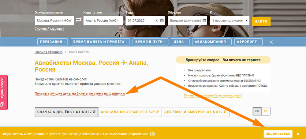 - Задайте в поисковой форме билетов нужное вам направление, дату полёта и количество пассажиров.
