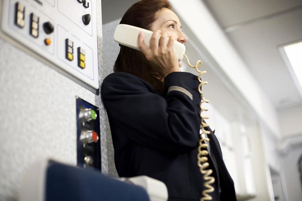 «Телефон» около входа в самолет — это переговорное устройство, без которого работа стюардесс превратилась бы в настоящий ад. В зависимости от модели воздушного судна, бортпроводники располагаются в различных его частях: в носовой части, в середине и в хвостовой части салона. Общение между членами экипажа проходит именно с помощью этого устройства: по нему они переговариваются с другими бортпроводниками, докладывают пилотам об обстановке в салоне, готовности пассажиров к взлету/посадке, все ли в порядке или не очень. Иначе стюардессам приходилось бы то и дело бегать с одной части салона в другую, теряя массу времени, а в критических ситуациях время на вес золота.Так же это устройство, при переключении в другой режим, используется как громкоговоритель. По громкой связи через эту трубку пассажирам сообщается нужная информация.
