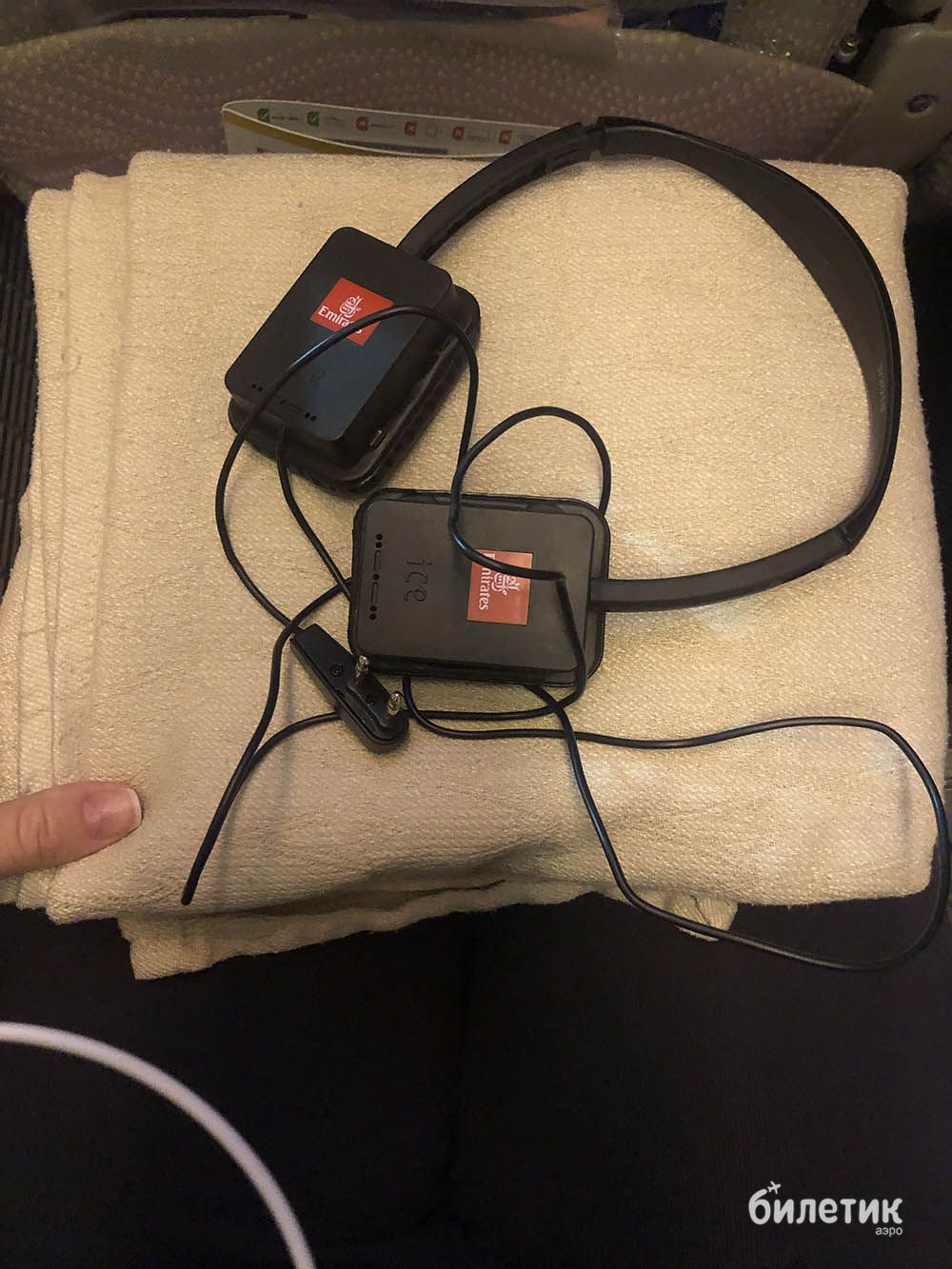 Для каждого пассажира были приготовлены плед и наушники, упакованные в пластиковые пакеты. Наушников я до этого тоже ни в одном самолёте не получала, сначала ещё думала, куда их вставлять. На спинках кресел установлены сенсорные экраны, с помощью которых можно слушать музыку и смотреть, где пролетает самолёт и на какой высоте.