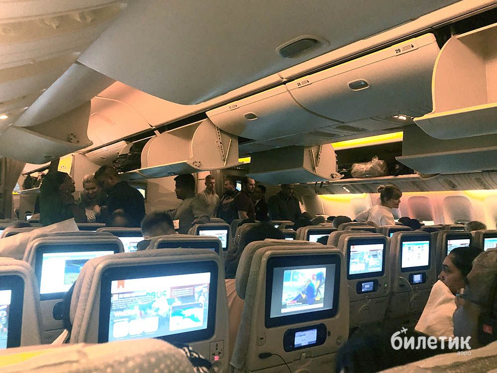 Первое, что меня удивило, так это количество кресел и пространство самолёта. Он просто гигантский! Я привыкла, что для того, чтобы попасть в туалет, тебе приходится занимать очередь в проходе рядом с другими сидящими пассажирами. Но тут между креслами и уборной есть небольшая площадка для ожидания. А ещё, если человек впереди тебя откинул спинку сиденья, остаётся достаточно места для ног, ты не окажешься «в ловушке».Ручная кладь складывается в отсеки сверху. Тут я не заметила каких-то особых преимуществ багажного отделения.