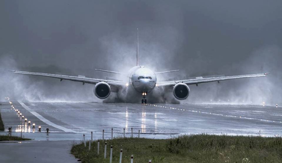 • сильный дождь (ВПП покрыта слоем воды или скользкая от дождя);