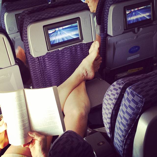 По правилам этикета, ноги должны находиться на полу. В обуви. Если хочется удобства во время длительного перелета – положите в ручную кладь сменный комплект одежды и домашние тапочки. Когда экипаж разрешит вставать с кресел, переоденьтесь в туалете, а снятые вещи аккуратно сложите в сумку.