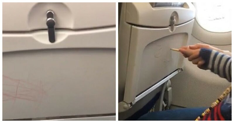 Маленький ребенок разрисовал все откидные столики на борту, прикреплённые к креслам спереди. Родители начинающего Пикассо даже не попытались объяснить ему, что так делать нельзя. Более того, помогали вдохновленно рисовать «каляку-маляку».Ответа на вопрос «зачем это нужно было делать?» мы никогда не узнаем.