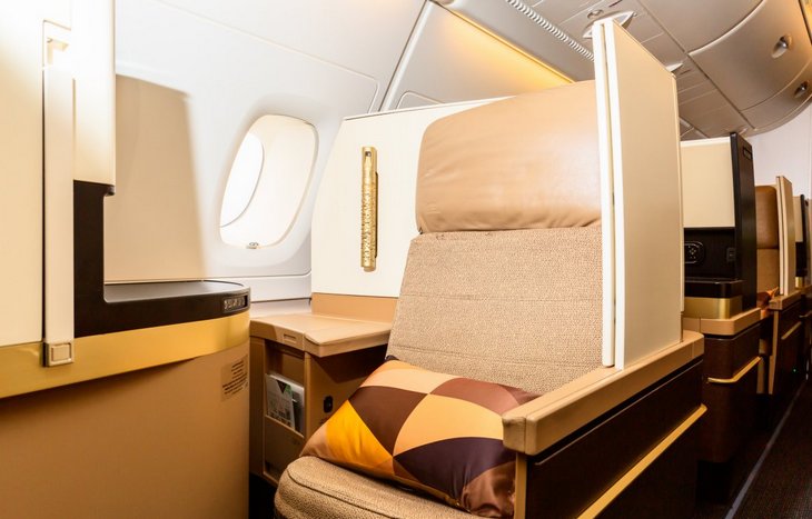Изящные стюардессы (некоторые — победительницы конкурсов красоты) предложат пассажиру бизнес-салона целый набор почти легендарных услуг. Тут вам и идеальное обслуживание, и изысканное меню с омарами, и 18-дюймовый экран. Но настоящая «изюминка» — это кресла! Изготовленные из углеродных волокон и обитые великолепной кожей, они могут фиксироваться в разных, максимально эргономичных для седока, положениях, раскладываться в совершенно плоскую 2-метровую кровать, «предлагая» пассажиру матрас, пуховое одеяло с льняными простынями и подушкой.