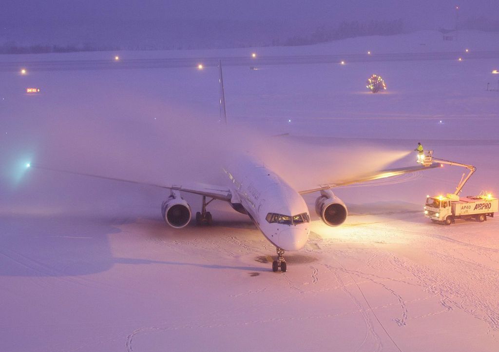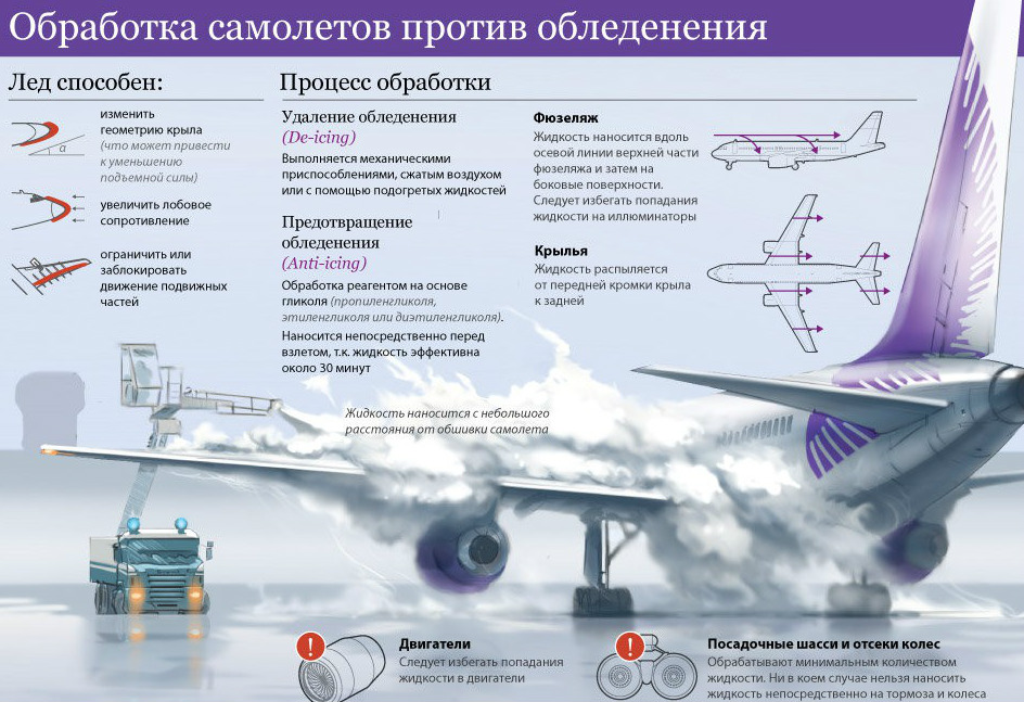 Когда на улице холодно, мокрый снег или дождь, высокая влажность самолеты нуждаются в специальной обработке против обледенения. Осадки, попадая на обшивку воздушного судна при низкой температуре, превращаются в ледяную оболочку, что изменяет профиль аэродинамических поверхностей. Вследствие этого, нарушается обтекание воздухом, а значит ведет к значительной потере подъемной силы.Кроме того, увеличивается вес лайнера, что может привести к выходу из строя механизмов машин (в том числе и двигателей), повлиять на безопасный взлет и набор высоты. Для того чтобы этого не случилось, перед вылетом самолет обрабатывают специальной противообледенительной жидкостью. Ни один самолет не имеет право взлететь, если на его критических поверхностях имеются снег или лед .