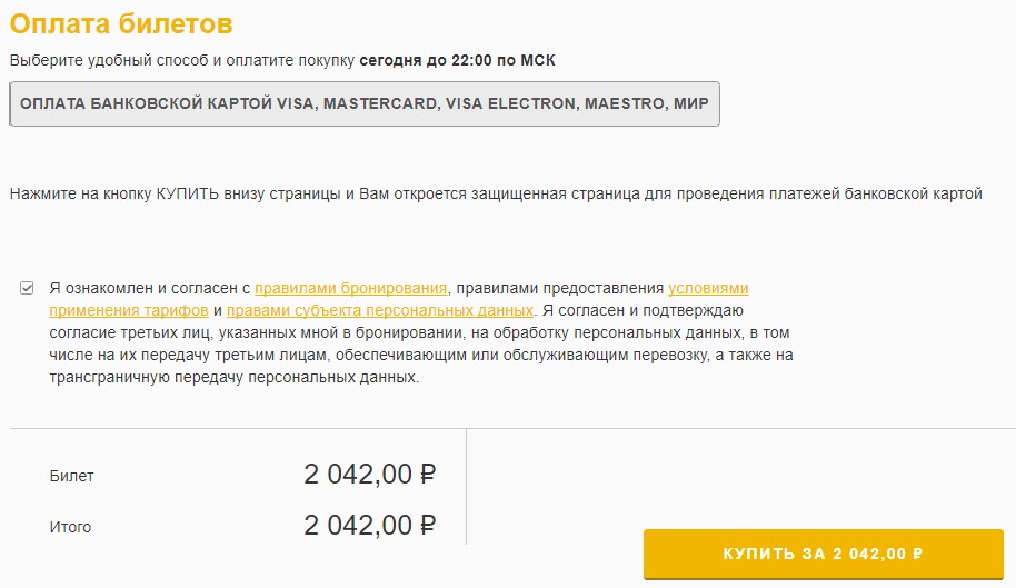 Выберите удобную для Вас валюту оплаты (RUB, USD, EUR) и способ оплаты. Пошаговая инструкция оплатой банковской картой здесь.Подробную информацию о том, как оплатить билет банковской картой, можно найти здесь.