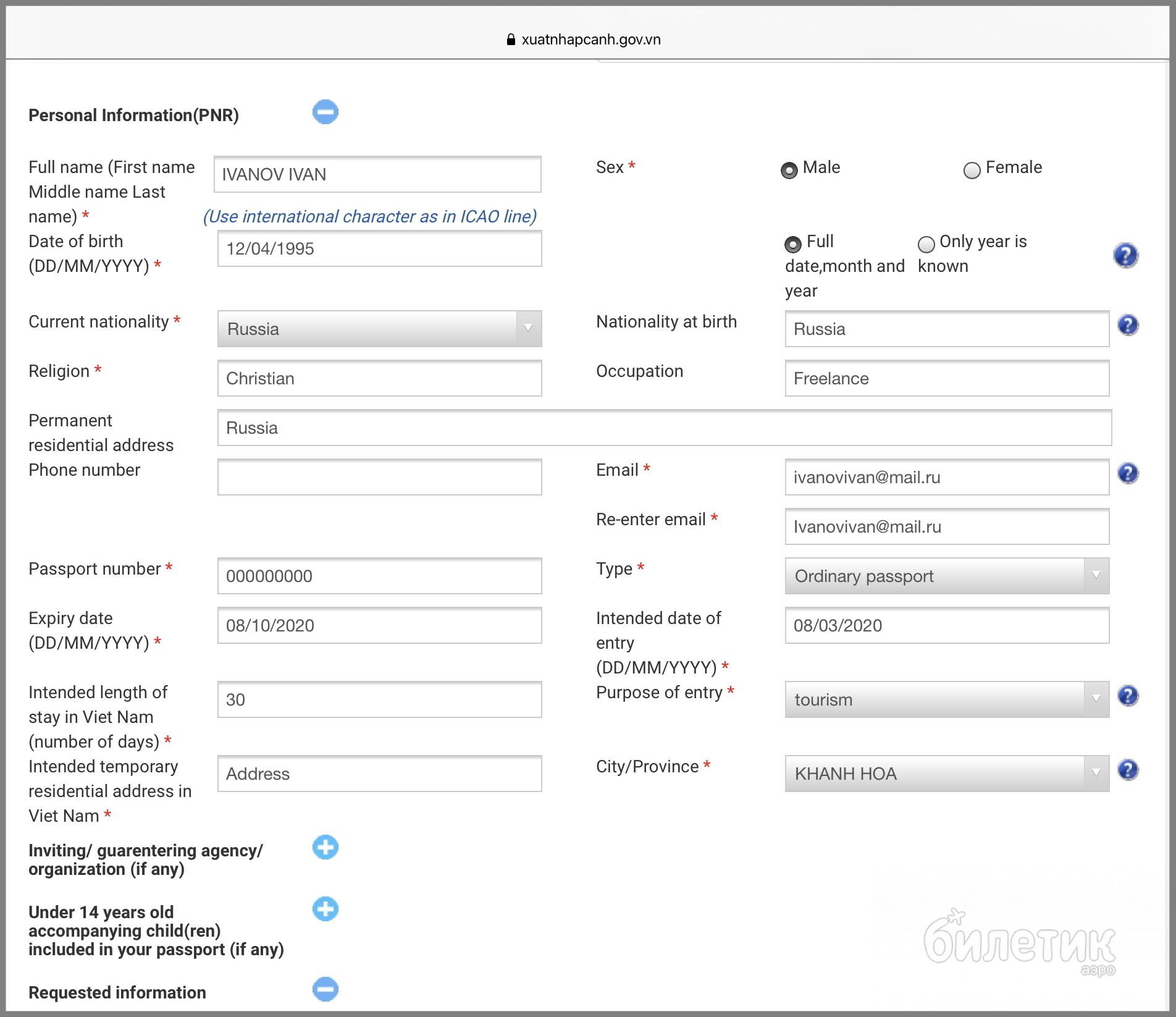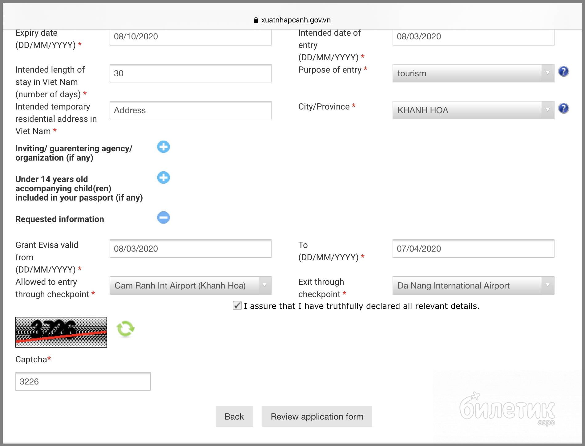 В разделе Intended temporary residential address in Viet Nam — предполагаемый адрес во Вьетнаме — указываем адрес отеля.