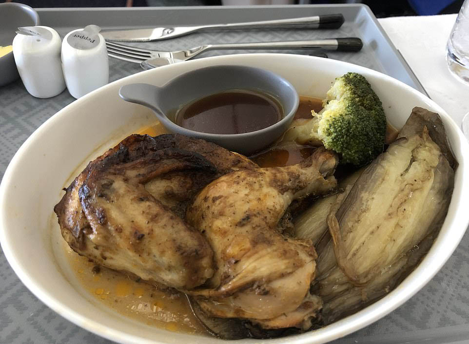 Вскоре после взлёта пассажирам предлагают обеденное меню: на выбор три варианта закусок и основных блюд. После того, как стюардесса приняла заказ, накрывают на стол — белая скатерть, бокал шампанского Bollinger и небольшой лоток с орехами (миндаль и кешью). Идеальное начало трапезы! Гребешки с японским соусом и курица с баклажаном и брокколи — обед, который заказала Дженнифер — вполне удовлетворили пассажирку. Девушка также отметила широкий ассортимент винной карты и сервировку: все блюда подаются в фирменной посуде «Аэрофлота», напитки — в стеклянных бокалах. Во время обратного перелёта, когда подавалось меню завтрака, Дженнифер предпочла кукурузную кашу с круассаном, джемом и йогуртом. Хотя выбор, конечно, непростой — также можно отведать фриттату с овощами или блинчики с индейкой в сырном соусе.